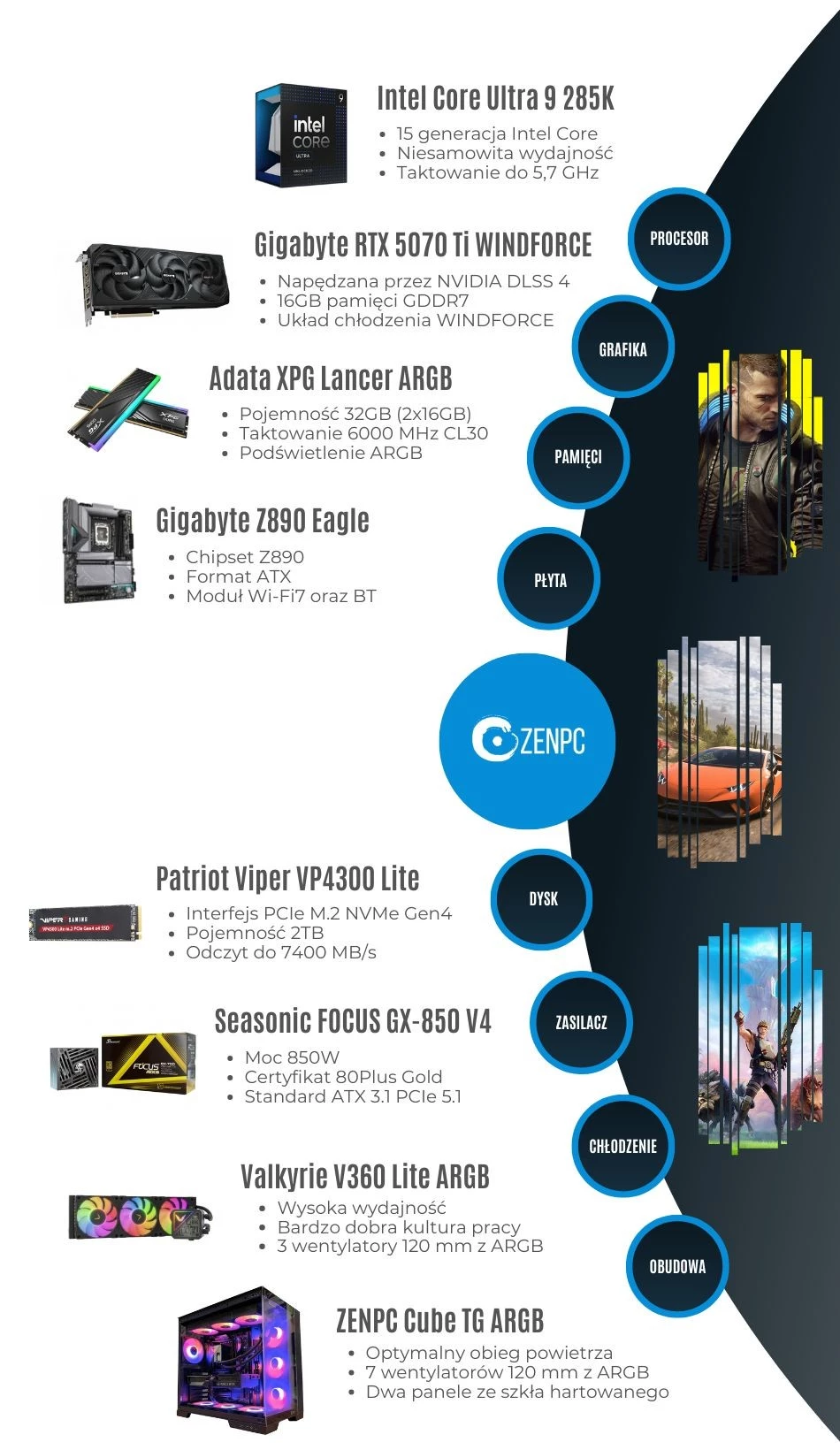 Dodaj pierwszą opinię: ZENPC Gaming Intel Ultra 9 285K RTX5070Ti 2TB 32GB ARGB DLSS 4Raty