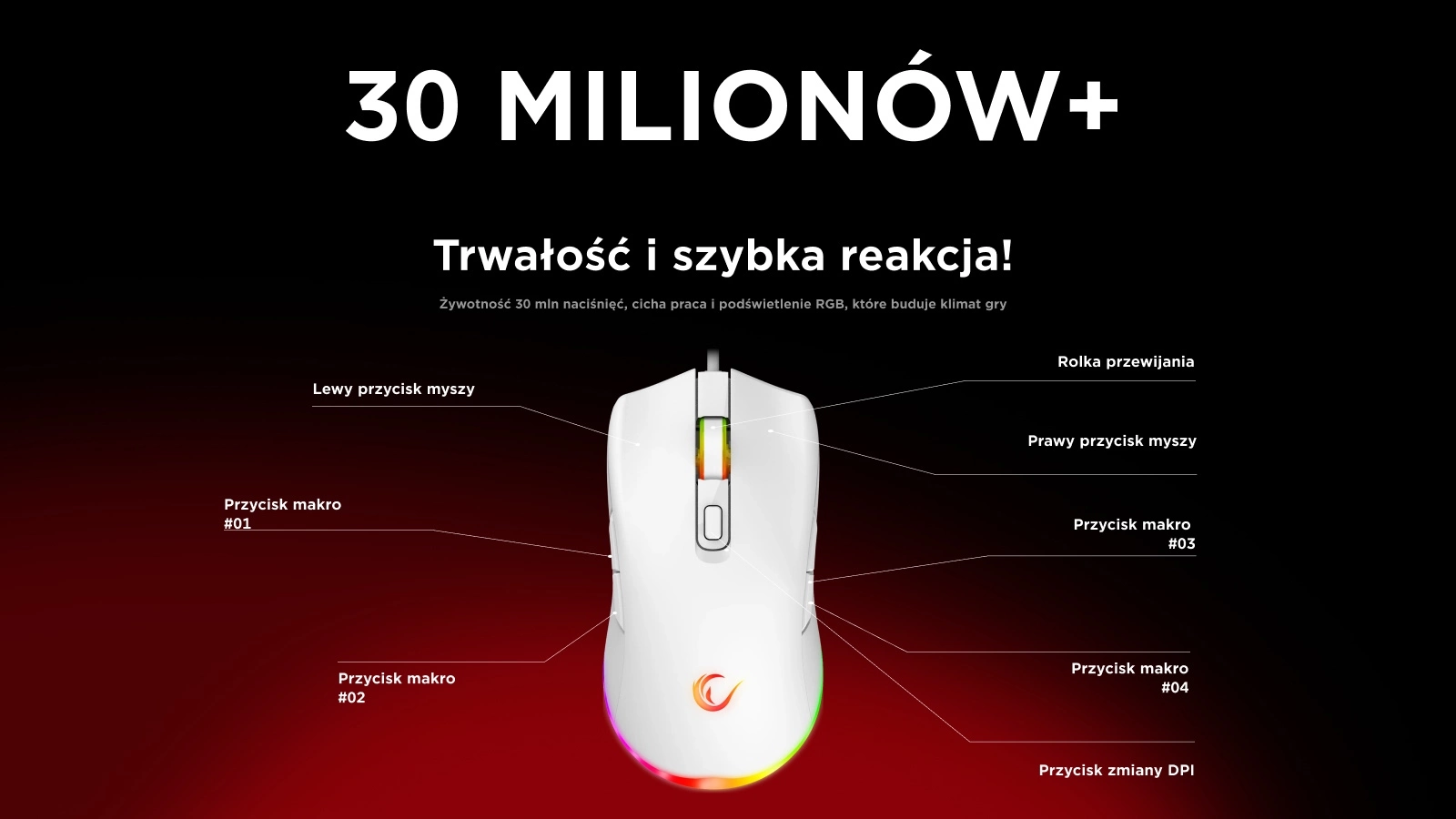 - Liczba przycisków myszy: 8 elementów – w tym cztery w pełni programowalne przyciski makro ułatwiające personalizację sterowania.
