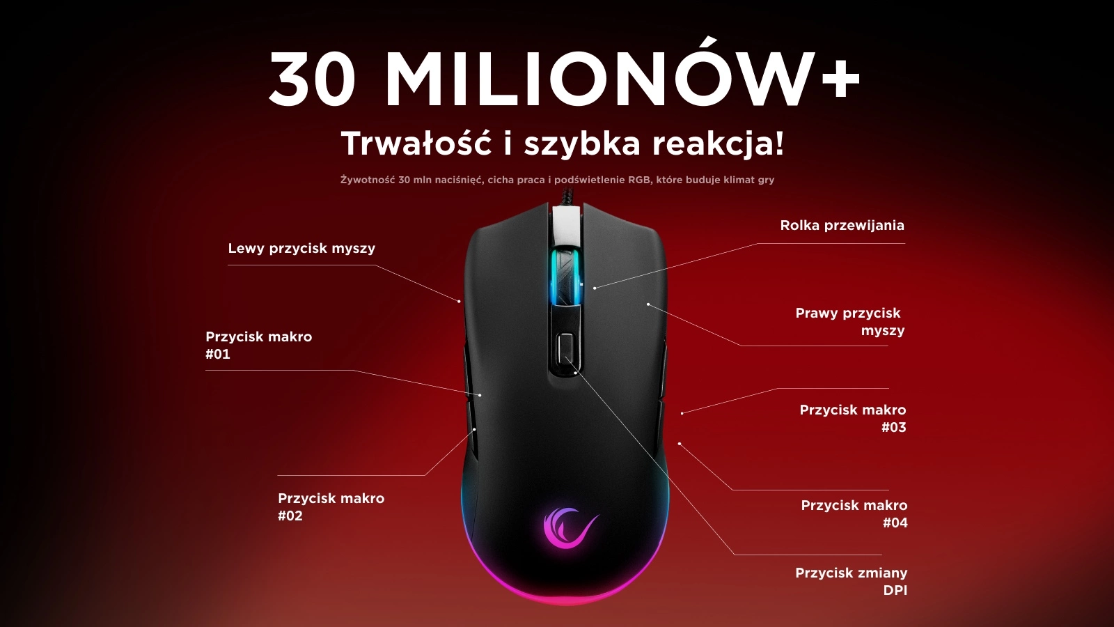 - Trwałość: 30 milionów kliknięć – wysoka żywotność podzespołów gwarantująca bezawaryjne działanie przez długi czas.