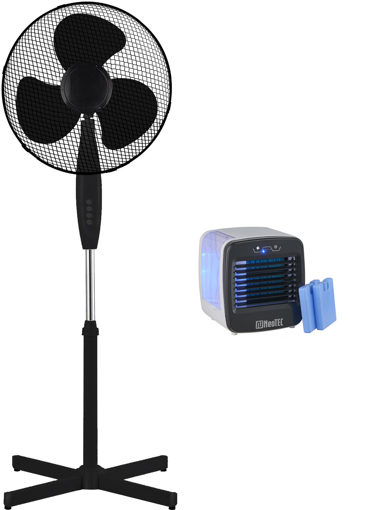 Zestaw wentylator stojący podłogowy NeoTEC NTF-161X i klimator na lód NeoTEC OneCool NTC-OC1, dwa pojemniki, czarny